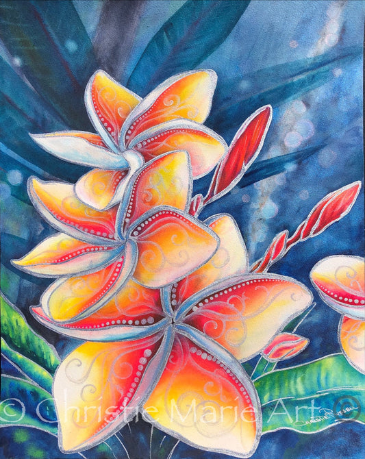 Original Art, "Mana" Stylized Watercolor mixed media, Tropical Hawaiian Plumeria Flowers, Frangipani flower art by artist Christie Marie Elder-Russell