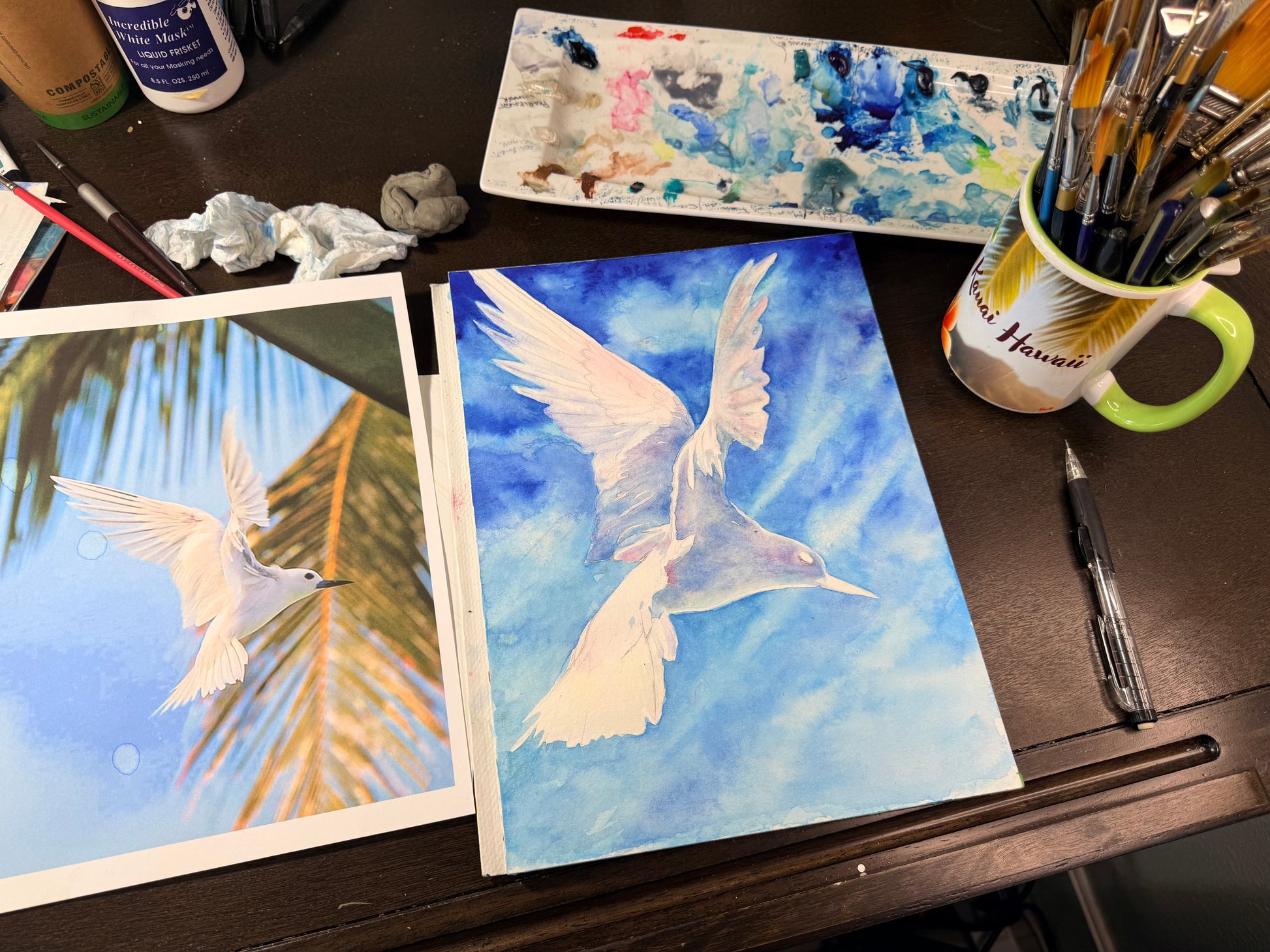 I painted this in luminous watercolors, inspired to capture the soft layering of clouds with calming blue sky for the backdrop of this delicate yet resolute little white miracle bird. My intention was to create a painting with a sense of peaceful calm yet energizing hope which is one of the great gifts the Manu-o-Kū brings to people.