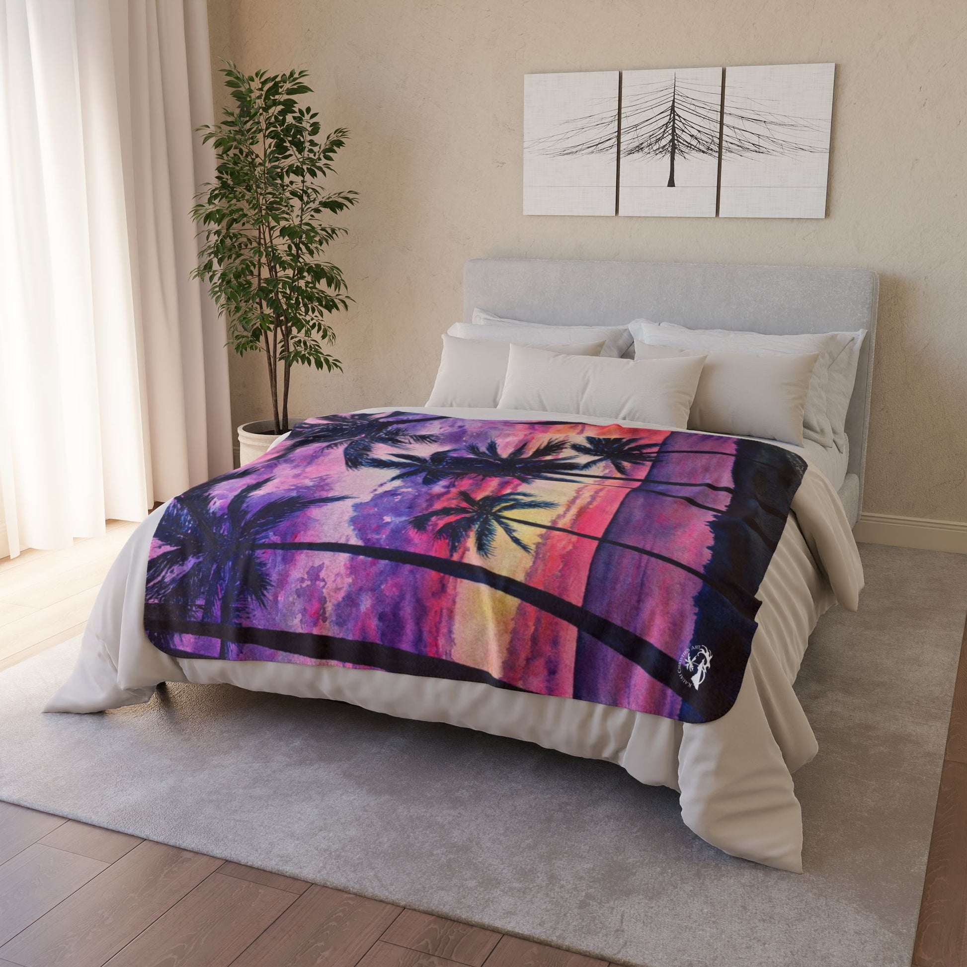 Pink Palms Tropical Sunset Fleece Sherpa Blanket — Palm Trees Purple Pink Beach Throw