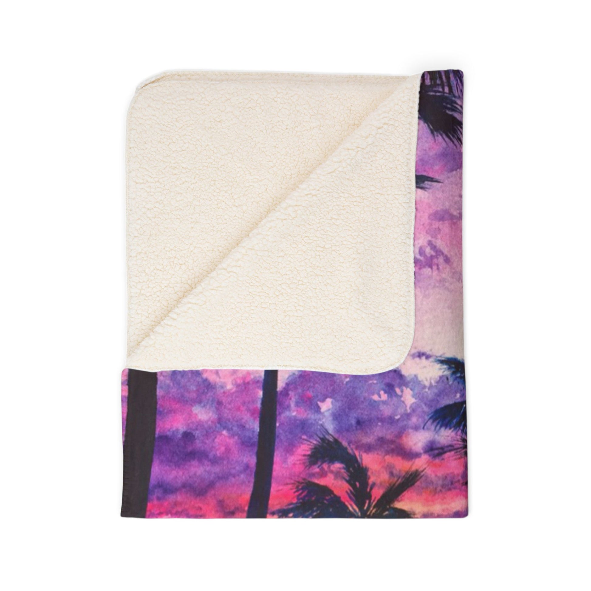 Wrap yourself in a warm, colorful sunset with this sherpa fleece blanket. Soft, thick polyester embraces you like an evening breeze while tall palm silhouettes and rich magentas, purples, and golds pull you toward slower moments. It’s the kind of throw you reach for after a long day — to curl up with a book, rest on the couch during movie night, or take outside to watch dusk settle. The plush texture on both sides keeps heat in and brings a tactile comfort that feels like a seaside memory, even when you’re miles from the shore.