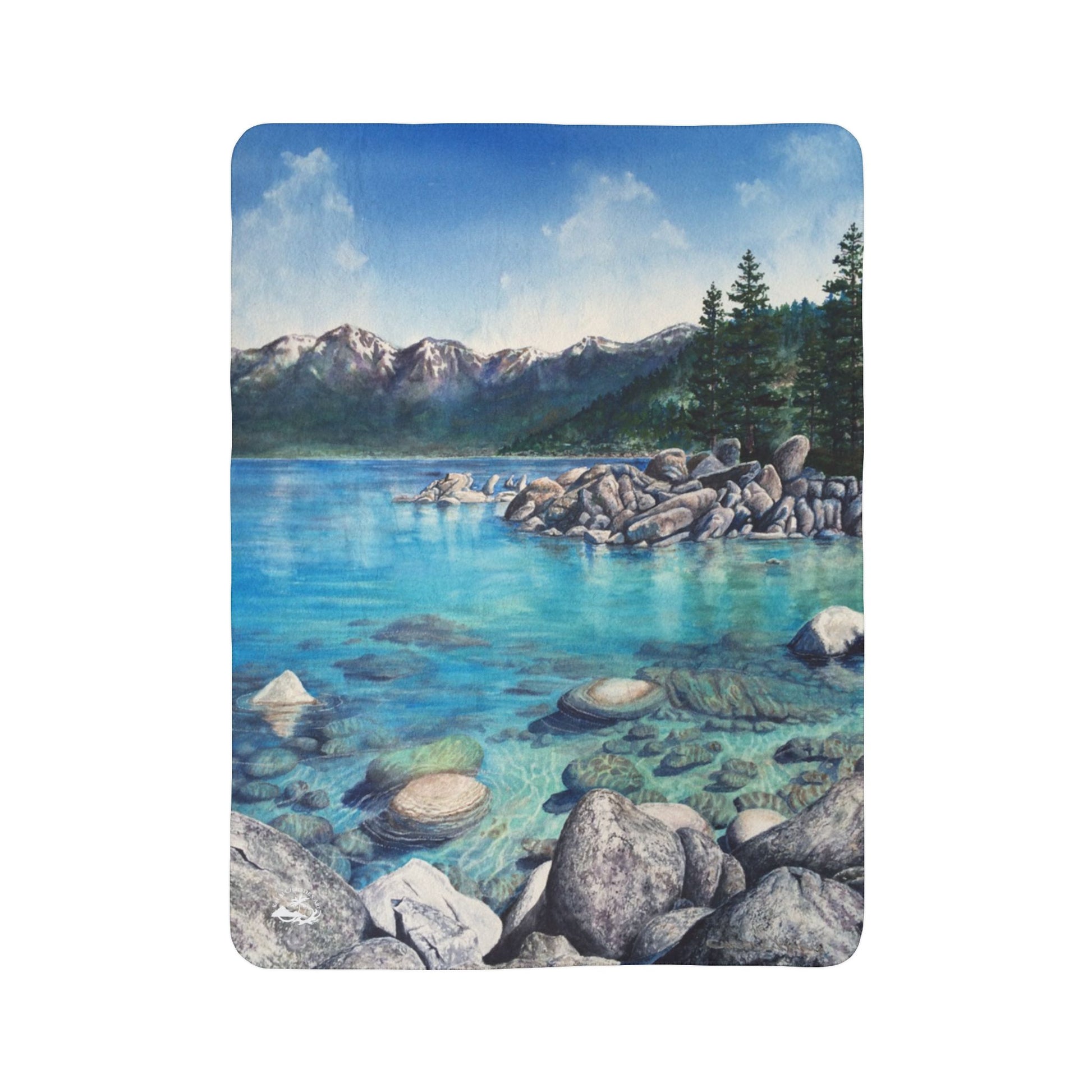 Scenic Mountain Lake Tahoe, Sand Harbor Watercolor Art Fleece Sherpa Blanket — Tranquil Nature Throw
