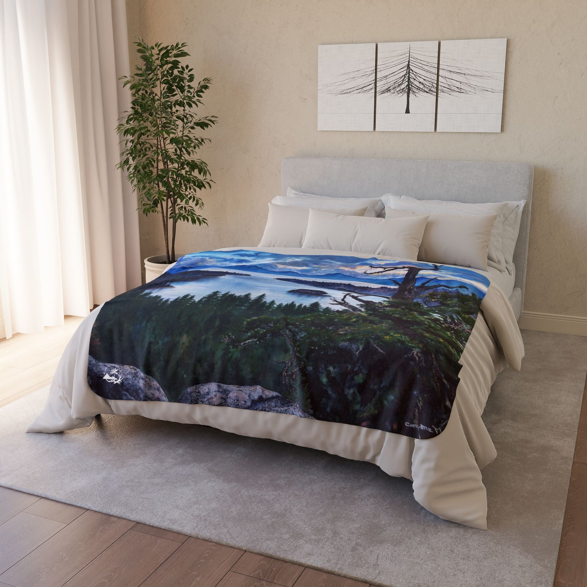 rendered in deep blues and forest greens. It’s the kind of throw that slows breath and invites you to sit by a window with hot tea, or curl up on the couch after a long trail. The dense fleece holds warmth without weight; the printed side keeps the landscape vivid so the view stays with you whether you’re reading, resting, or sharing stories around a low lamp. For cabin nights, post-hike recovery, or just bringing a slice of the backcountry into your living room, this blanket feels like a quiet companion you reach for again and again.