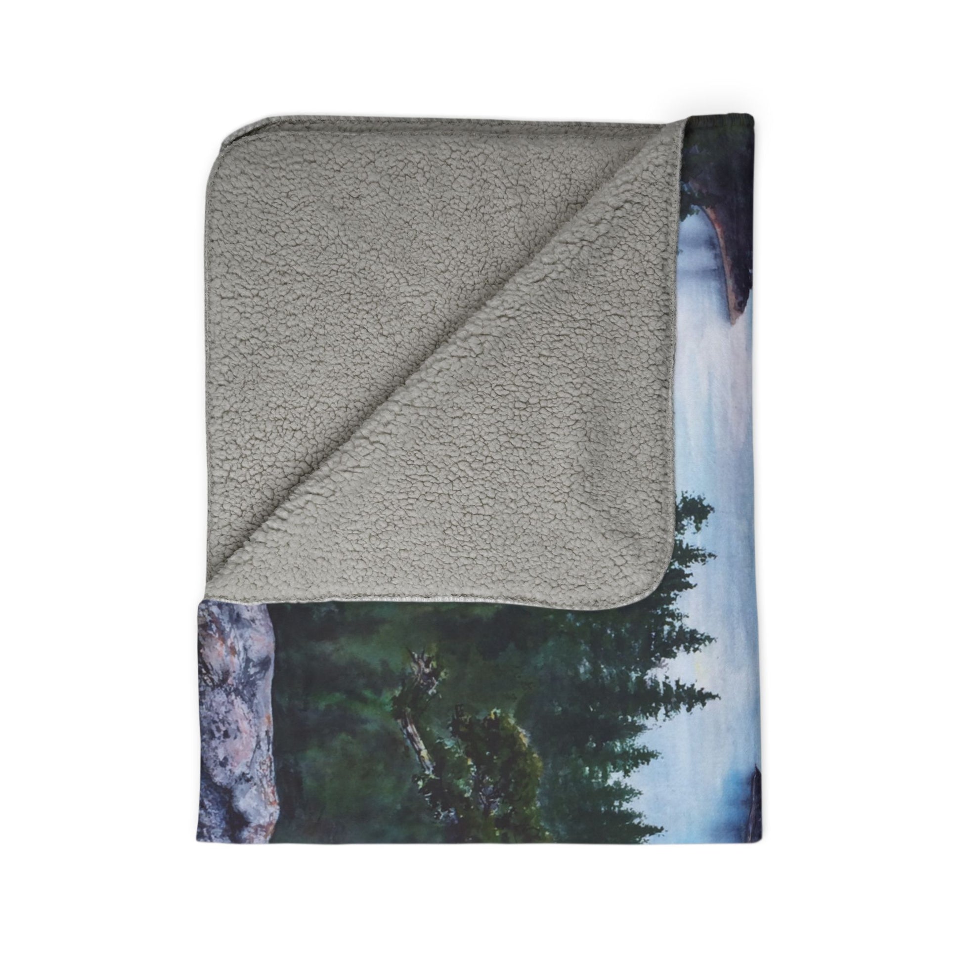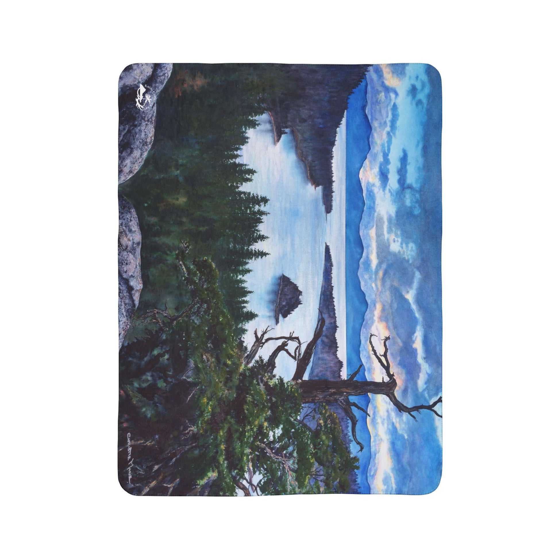 Wrap yourself in a quiet mountain evening. This plush sherpa blanket bears a painterly watercolor art print of Emerald Bay scene — wind-brushed pines, distant fannette island, and a early morning snowstorm building in the sky ~