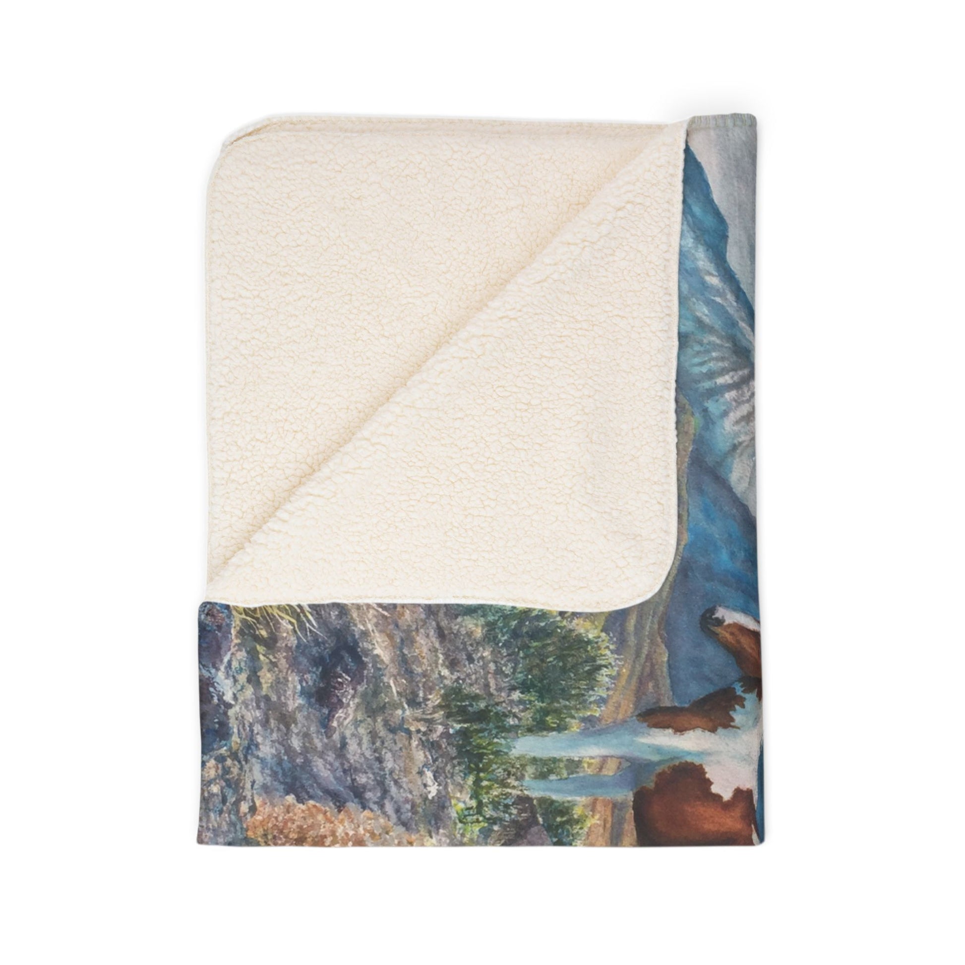 Lay this plush sherpa blanket across your lap and be carried to high desert ridgelines where wild horses pause to drink in the view. In this artwork two wild horses — a glossy black stallion and a paint — standing against sweeping mountains and a dramatic sky. The thick, double-sided-feel polyester fleece holds vibrant, painterly color so the scene stays vivid through long evenings of reading, stargazing, or slow morning coffee. Tailored edges and a matched seam thread give it a finished look on the couch or at the foot of a bed. For Horse lovers who live for open spaces and quiet connection with the outdoors, this blanket brings that calm into everyday life.